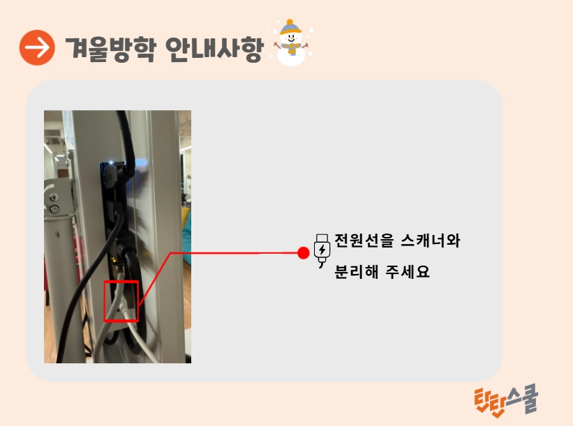 방학 기간 스캐너를 사용하지 않을 때는 전원 선을 분리해 주세요. 스캐너의 전기선을 콘센트에서 분리하여 전원 공급을 완전히 차단하되, 인터넷 랜선은 그대로 유지해 주세요.