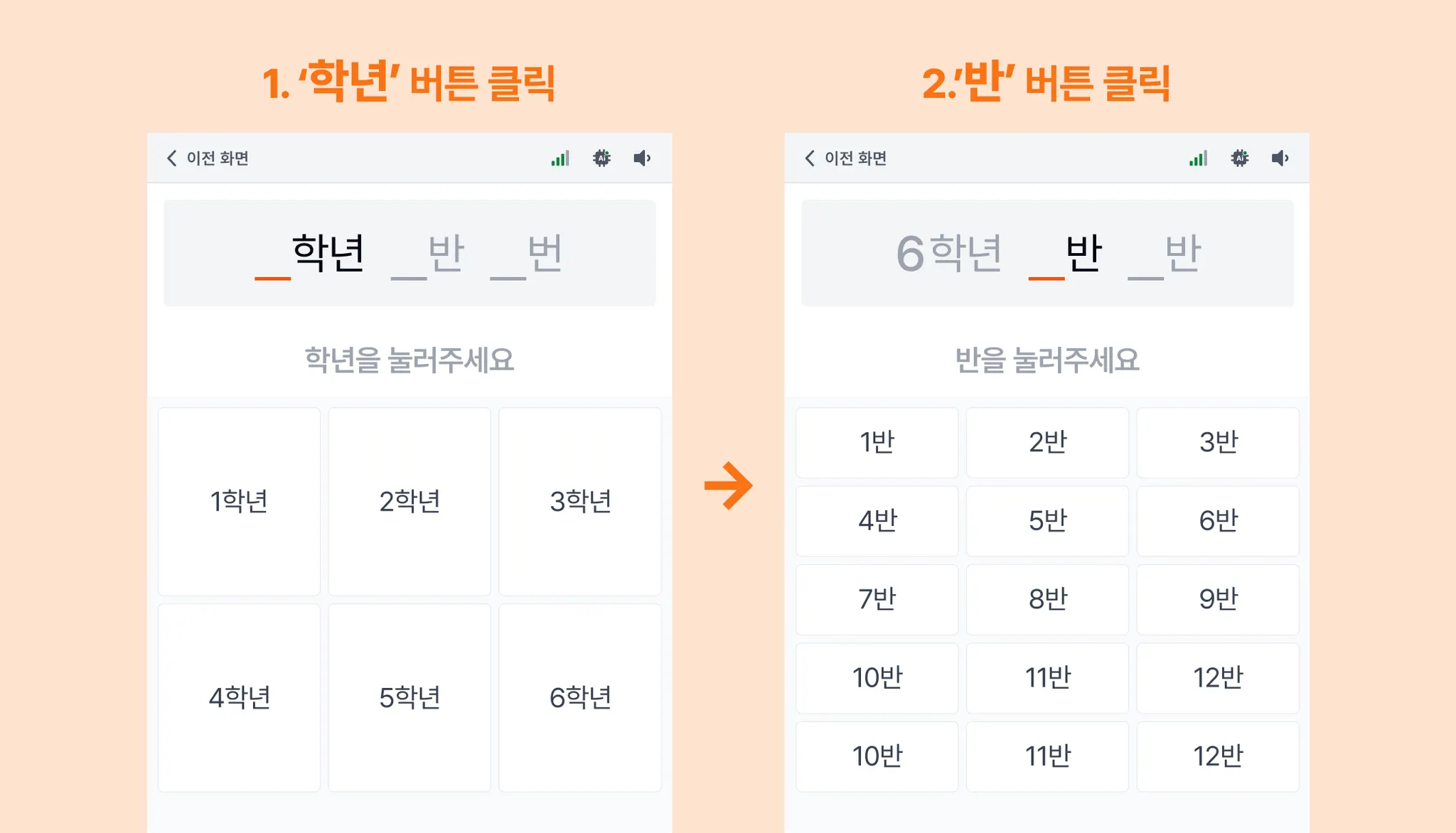 스캔이 완료되면 개인 정보 입력 화면으로 전환됩니다. 학생 본인의 학년과 반 버튼을 차례로 클릭해요.