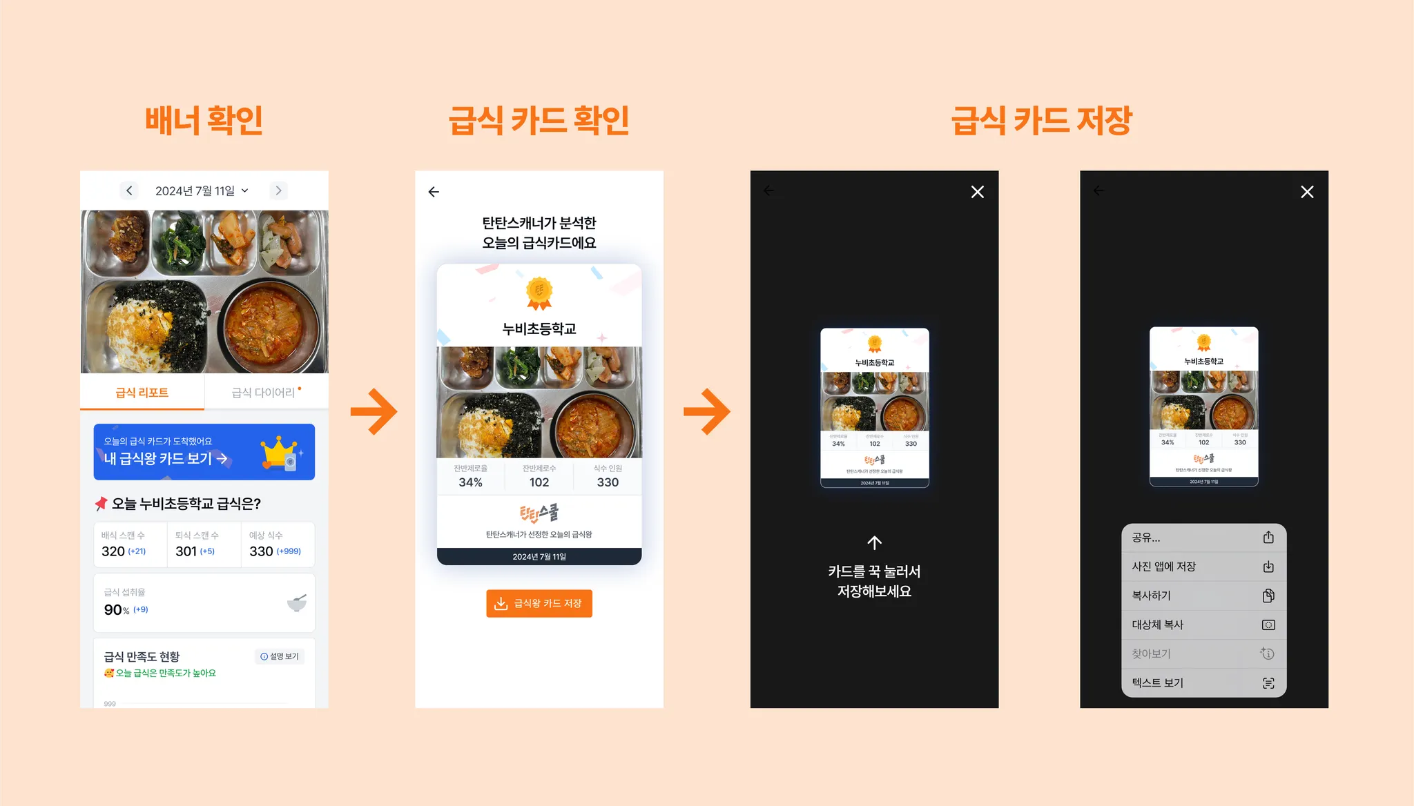 (모바일) 저장 버튼을 누르고 꾹 눌러서 급식 카드를 저장하고 공유해 보세요!